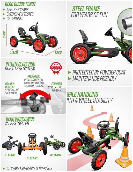 Prepare-se e siga! Divirta-se brincando ao ar livre, no BERG Buddy Fendt. Todos os karts Buddy têm um sistema único BFR, o que significa que pode pedalar para a frente, travão (contrapedal) e, após ficar parado, pedalar para trás, isto mesmo com roda livre automática. Assento ajustável para anos de diversão! Idade recomendada: 3-8 anos.