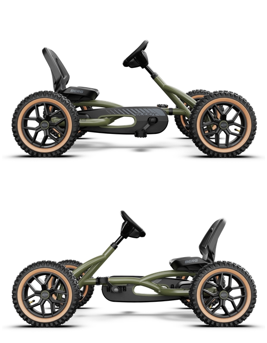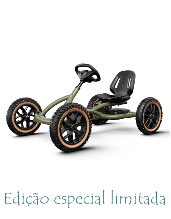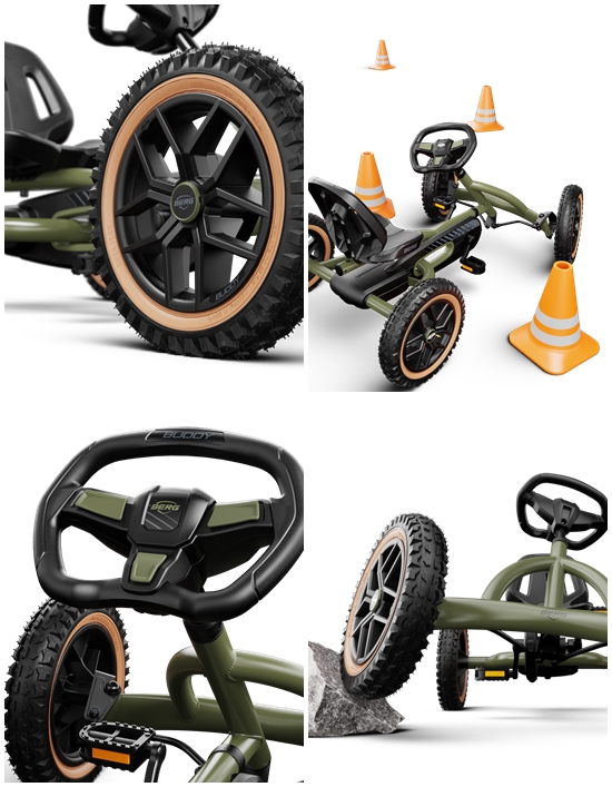 O carro a pedais Berg Buddy possui 4 pneus pneumáticos extremamente sólidos. Em combinação com o eixo oscilante tornam-no seguro e estável.